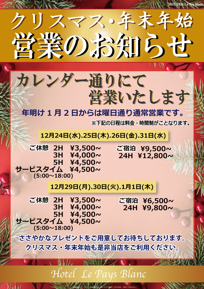 ★クリスマス・年末年始期間の営業時間と料金について ★