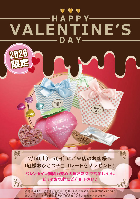 2/13(木)、14(金)にご来店のお客様へ、チョコレートをプレゼント!バレンタイン期間も安心の通常料金で営業します。是非ご利用下さい♪